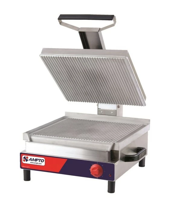 Whether used at a cafe, deli, or food truck, the Ampto SSGE Large Electric Sandwich Grill, Ribbed is perfect for grilling up a variety of foods. This unit delivers uniform heating while its ribbed cast aluminum grid plates leaves tantalizing grills marks.