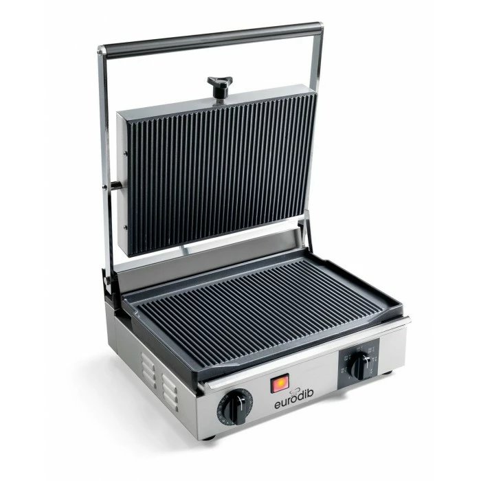 Serve up delicious sandwiches, wraps, and hamburgers without taking up too much space with the Eurodib CORT-R Single Grooved Panini Grill 15″ x 10″. A must-have in diners, concession stands and snack bars, this unit is made from high quality stainless steel with cast iron cooking plates for outstanding durability. The cast iron plates and shockproof heating elements provide even heat distribution and excellent heat retention.