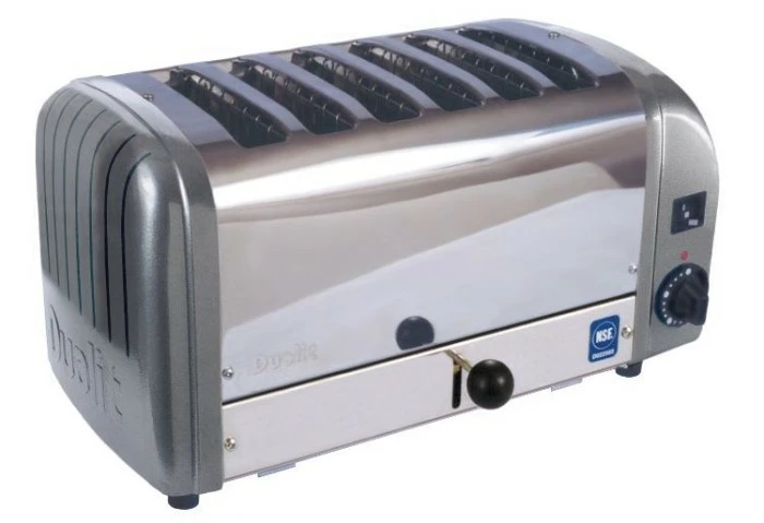 To control heating and browning settings, it has a manual timer control as well as a manual ejector with a keep-warm feature so food items are always ready to serve. Easy to clean, this toaster has a pull-out crumb tray. Built with stainless steel housing and attractive metallic gray end panels, this 6-slot toaster will withstand high volume commercial use.